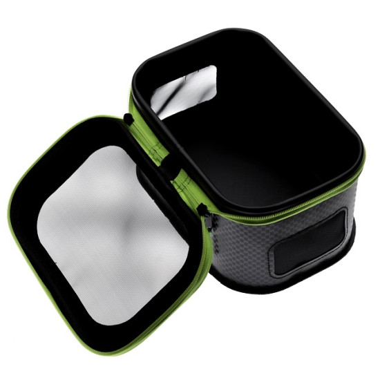 Fabricata din material EVA de inalta calitate, usor de curatat si extrem de rezistent la umezeala si deformari, borseta se remarca printr-un design practic si functional. Capacul este prevazut cu suprafete perforate acoperite cu micro plasa, care permit o ventilatie optima, mentinand momeala proaspata si prevenind acumularea de mirosuri neplacute. Acest sistem de aerisire este deosebit de util mai ales in conditii de temperaturi ridicate, cand prospetimea momelii poate face diferenta intre o partida productiva si una compromisa.