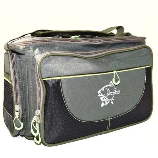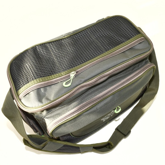 3. **Compartimente și Buzunare Multiple**: Geanta este echipată cu multiple compartimente și buzunare exterioare și interioare, care permit organizarea eficientă a echipamentului și accesul rapid la diferitele accesorii de pescuit.